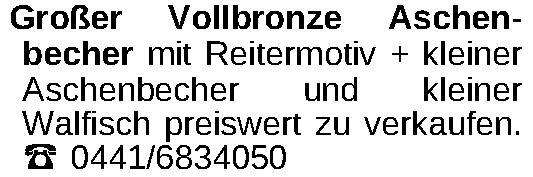 Großer Vollbronze Aschenbecher mit Reitermotiv + kleiner Aschenbecher und kleiner Walfisch preiswert zu verkaufen. 0441/6834050