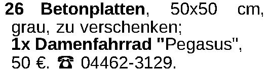 26 Betonplatten, 50x50 cm, grau, zu verschenken; 1x Damenfahrrad "Pegasus", 50 €. 04462-3129.