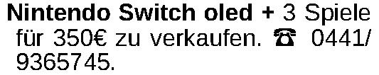 Nintendo Switch oled + 3 Spiele für 350€ zu verkaufen. ‡ 0441/ 9365745.Kontakt