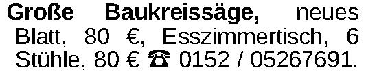 Große Baukreissäge, neues Blatt, 80 €, Esszimmertisch, 6 Stühle, 80 € 0152 / 05267691.