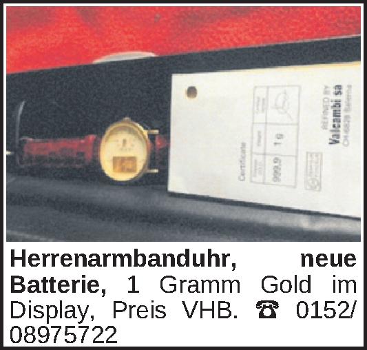 Herrenarmbanduhr, neue Batterie, 1 Gramm Gold im Display, Preis VHB. ‡ 0152/ 08975722Kontakt