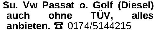 Su. Vw Passat o. Golf (Diesel) auch ohne TÜV, alles anbieten. ‡ 0174/5144215Kontakt