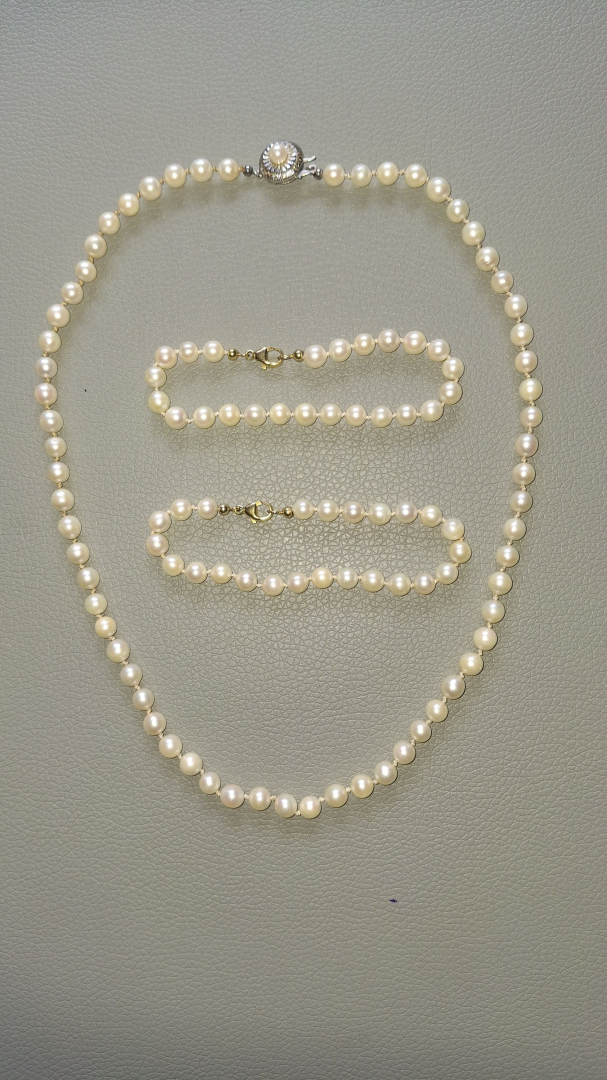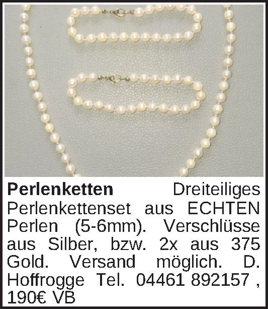 Dreiteiliges Perlenkettenset aus ECHTEN Perlen (5-6mm). Verschlüsse aus Silber, bzw. 2x aus 375 Gold. Versand möglich.D. Hoffrogge Tel. 04461 892157