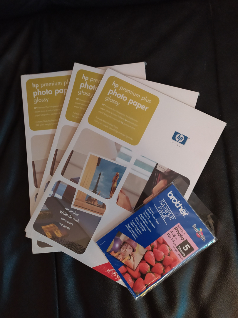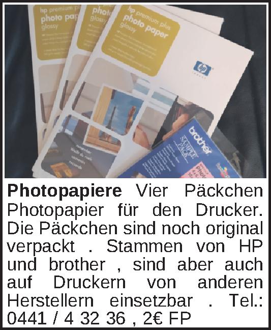 Vier Päckchen Photopapier für den Drucker.Die Päckchen sind noch original verpackt . Stammen von HP und brother , sind aber auch auf Druckern von anderen Herstellern einsetzbar .
