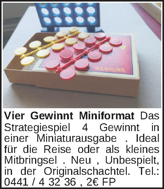 Das Strategiespiel 4 Gewinnt in einer Miniaturausgabe . Ideal für die Reise oder als kleines Mitbringsel . Neu , Unbespielt, in der Originalschachtel.Tel.: 0441 / 4 32 36