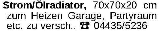 Strom/Ölradiator, 70x70x20 cm zum Heizen Garage, Partyraum etc. zu versch., ‡ 04435/5236Kontakt