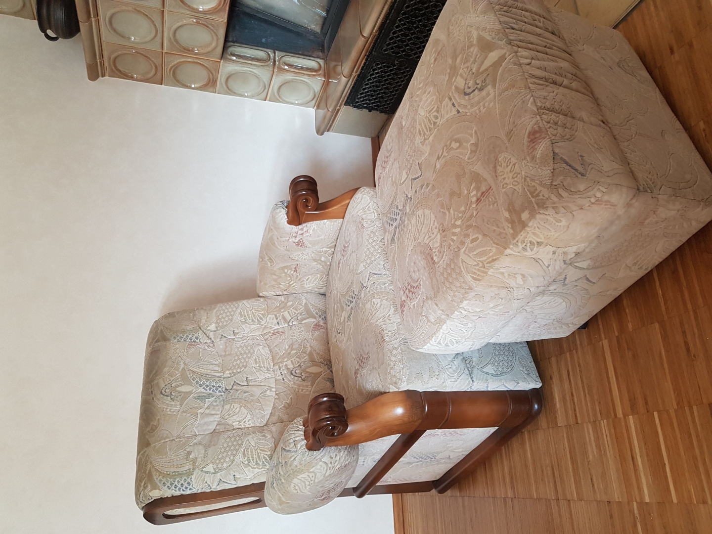 Verschenke gut erhaltenen Sessel mit Hocker, mit beigefarbenem Muster auf Rollen. Der Sessel hat einen Holzrahmen und ist nicht verstellbar. Gesamthöhe von 95 cm und Gesamtbreite 85 cm. Die Sitzbreite beträgt innerhalb der Armlehnen 58 cm. SitzflächeKontakt
