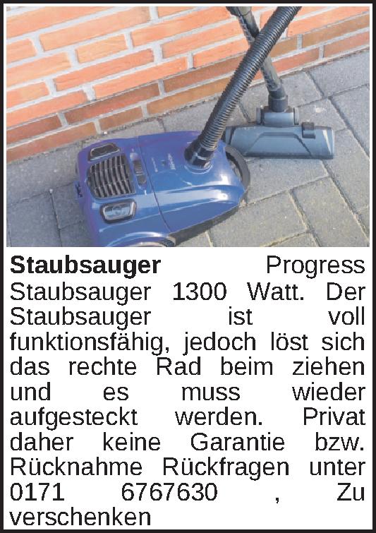 Progress Staubsauger 1300 Watt.Der Staubsauger ist voll funktionsfähig, jedoch löst sich das rechte Rad beim ziehen und es muss wieder aufgesteckt werden.
