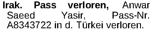 Irak. Pass verloren, Anwar Saeed Yasir, Pass-Nr. A8343722 in d. Türkei verloren.Kontakt