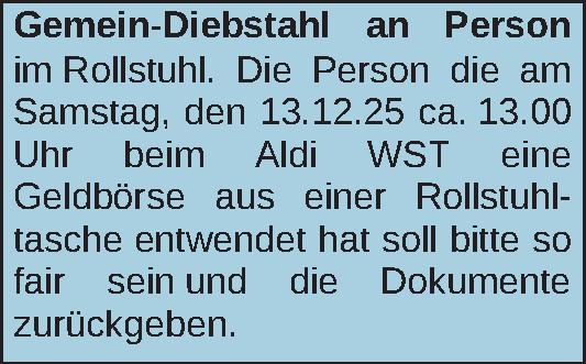 Gemein-Diebstahl an Person im Rollstuhl. Die Person die am Samstag, den 13.12.25 ca. 13.00 Uhr beim Aldi WST eine Geldbörse aus einer Rollstuhltasche entwendet hat soll bitte so fair sein und die Dokumente zurückgeben.Kontakt