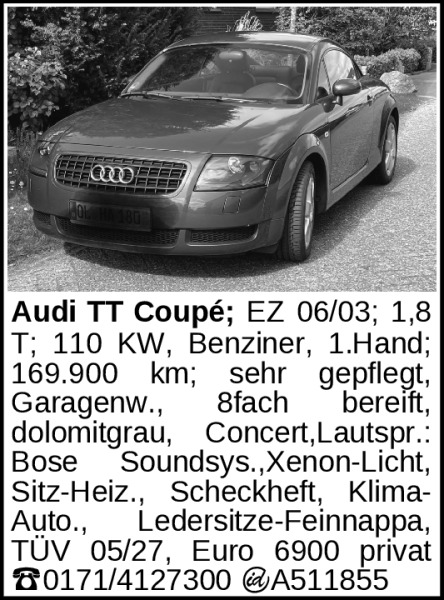 Audi TT Coupé; EZ 06/03; 1,8 T; 110 KW, Benziner, 1.Hand; 169.900 km; sehr gepflegt, Garagenw., 8fach bereift, dolomitgrau, Concert,Lautspr.: Bose Soundsys.,Xenon-Licht, Sitz-Heiz., Scheckheft, Klima-Auto., Ledersitze-Feinnappa, TÜV 05/27, Euro 6900 privat ‡0171/4127300 ¬A511855Kontakt