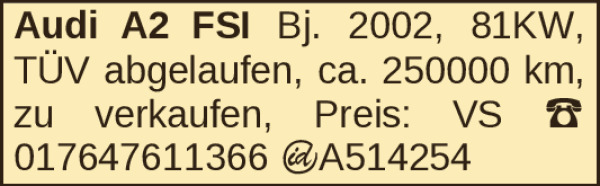 Audi A2 FSI Bj. 2002, 81KW, TÜV abgelaufen, ca. 250000 km, zu verkaufen, Preis: VS 017647611366 ¬A514254