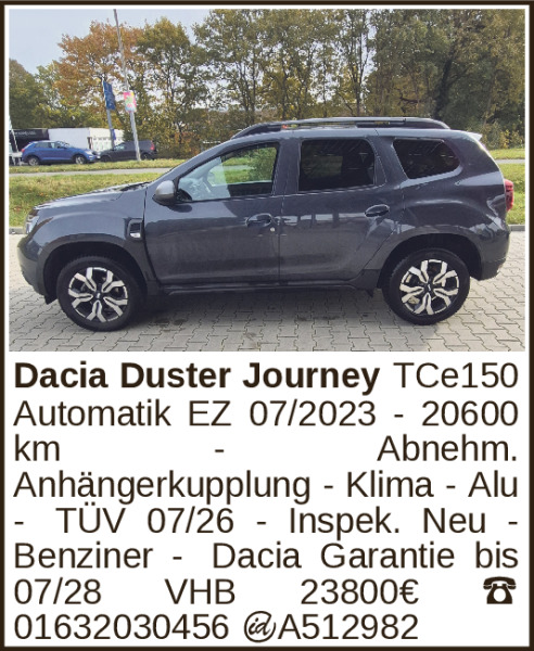 Dacia Duster Journey TCe150 Automatik EZ 07/2023 - 20600 km - Abnehm. Anhängerkupplung - Klima - Alu - TÜV 07/26 - Inspek. Neu - Benziner - Dacia Garantie bis 07/28 VHB 23800€ ‡ 01632030456 ¬A512982Kontakt
