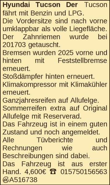 Hyundai Tucson Der Tucson fährt mit Benzin und LPG.Die Vordersitze sind nach vorne umklappbar als volle Liegefläche.