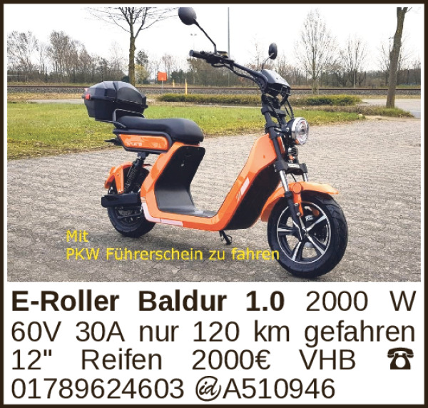 E-Roller Baldur 1.0 2000 W 60V 30A nur 120 km gefahren 12" Reifen 2000€ VHB ‡ 01789624603 ¬A510946Kontakt