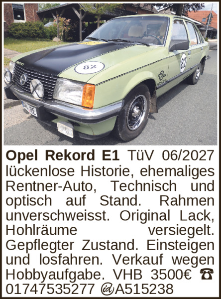 Opel Rekord E1 TüV 06/2027 lückenlose Historie, ehemaliges Rentner-Auto, Technisch und optisch auf Stand. Rahmen unverschweisst. Original Lack, Hohlräume versiegelt. Gepflegter Zustand. Einsteigen und losfahren. Verkauf wegen Hobbyaufgabe. VHB 3500€ ‡ 01747535277 ¬A515238Kontakt