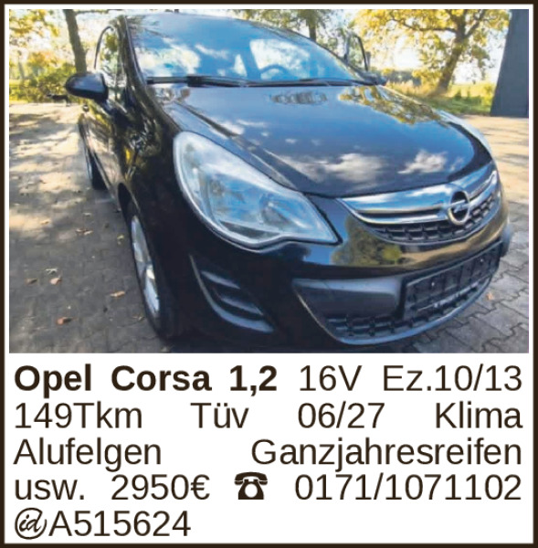 Opel Corsa 1,2 16V Ez.10/13 149Tkm Tüv 06/27 Klima Alufelgen Ganzjahresreifen usw. 2950€ ‡ 0171/1071102 ¬A515624Kontakt