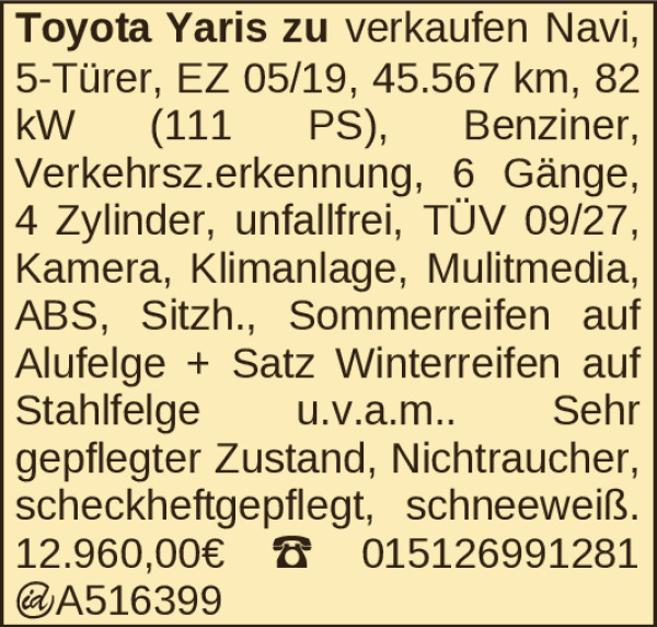Toyota Yaris zu verkaufen Navi, 5-Türer, EZ 05/19, 45.567 km, 82 kW (111 PS), Benziner, Verkehrsz.erkennung, 6 Gänge, 4 Zylinder, unfallfrei, TÜV 09/27, Kamera, Klimanlage, Mulitmedia, ABS, Sitzh., Sommerreifen auf Alufelge + Satz Winterreifen auf Stahlfelge u.v.a.m.. Sehr gepflegter Zustand, Nichtraucher, scheckheftgepflegt, schneeweiß. 12.960,00€ 015126991281 ¬A516399