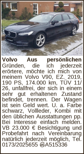 Volvo Aus persönlichen Gründen, die ich jederzeit erörtere, möchte ich mich von meinem Volvo V90, EZ. 2019, 190 PS, 174.000 km, TÜV 11/26, unfallfrei, der sich in einem sehr gut erhaltenen Zustand befindet, trennen. Der Wagen ist sein Geld wert. U. a. Farbe schwarz, Vollleder, Kombi mit den üblichen Ausstattungen pp. Bei Interesse einfach melden. VB 23.000 € Besichtigung und Probefahrt nach Vereinbarung natürlich jederzeit möglich, Tel. 0173/2025655