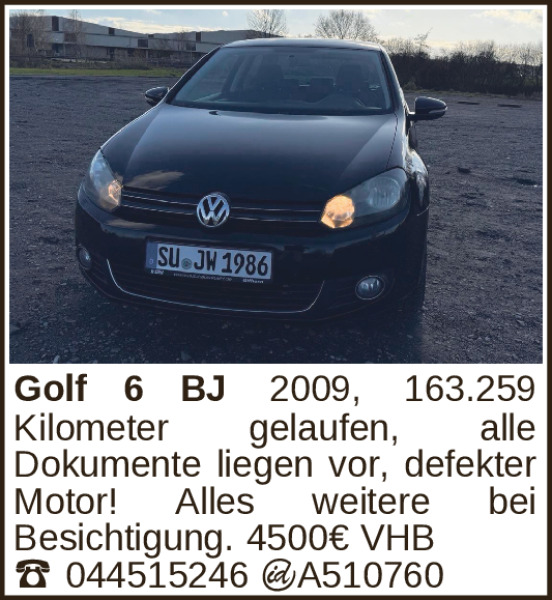 Golf 6 BJ 2009, 163.259 Kilometer gelaufen, alle Dokumente liegen vor, defekter Motor! Alles weitere bei Besichtigung. 4500€ VHB‡ 044515246 ¬A510760