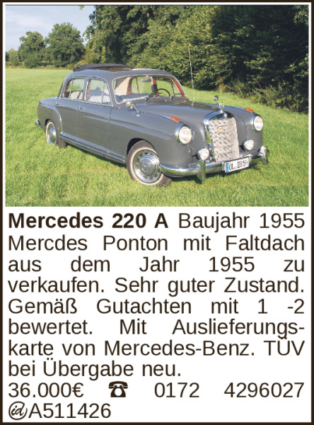 Mercedes 220 A Baujahr 1955 Mercdes Ponton mit Faltdach aus dem Jahr 1955 zu verkaufen. Sehr guter Zustand. Gemäß Gutachten mit 1 -2 bewertet. Mit Auslieferungs-karte von Mercedes-Benz. TÜV bei Übergabe neu.36.000€ ‡ 0172 4296027 ¬A511426