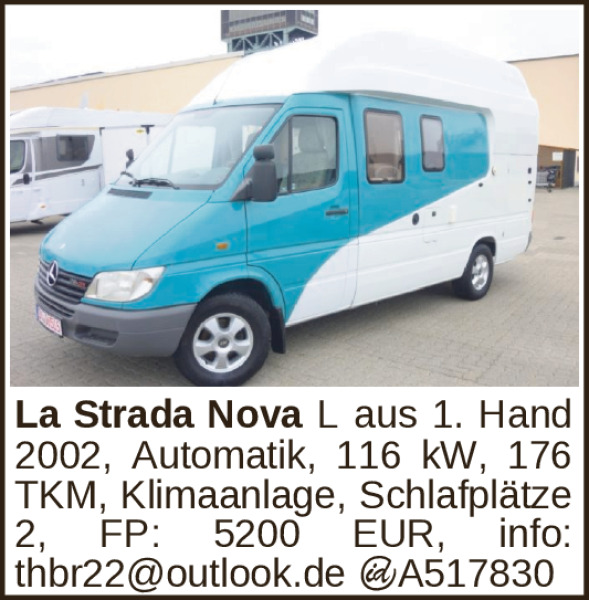 La Strada Nova L aus 1. Hand 2002, Automatik, 116 kW, 176 TKM, Klimaanlage, Schlafplätze 2, FP: 5200 EUR, info: thbr22@outlook.de ¬A517830Kontakt