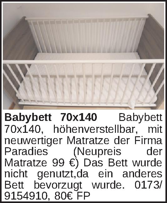 Babybett 70x140, höhenverstellbar, mit neuwertiger Matratze der Firma Paradies (Neupreis der Matratze 99 €)Das Bett wurde nicht genutzt,da ein anderes Bett bevorzugt wurde.