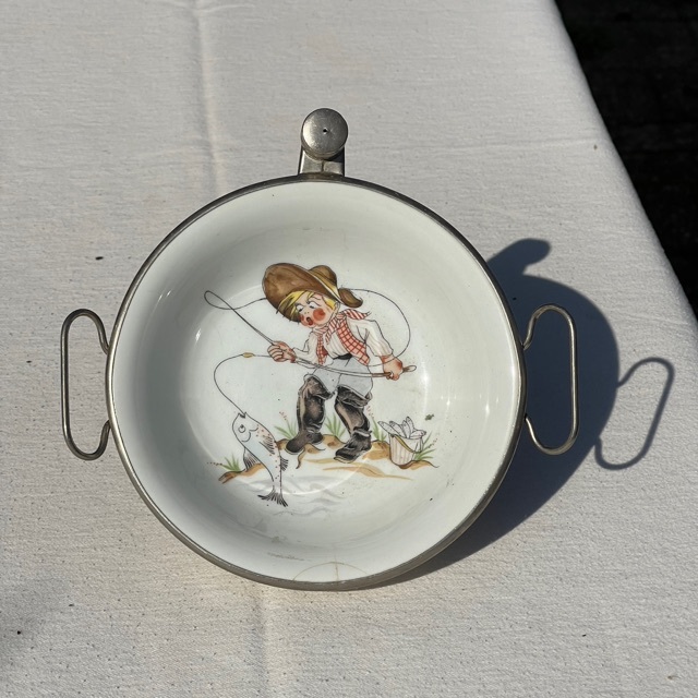 Ein kleiner Teller mit der Möglichkeit, das Essen warmzuhalten, indem der doppelwandige Boden mit heißem Wasser gefüllt wird.Kontakt