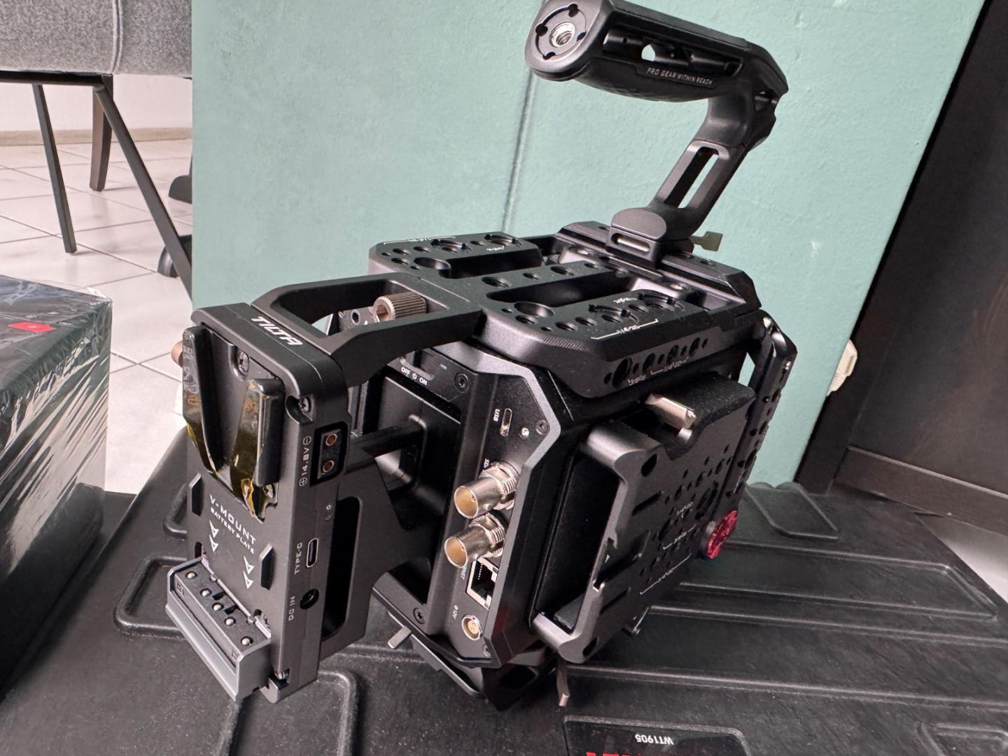Auch wenn alles Werkseitige (inkl. Verpackung) mit dabei ist, lege ich noch einen V-Mount-Akku mit dazu. Damit können Sie sofort starten.
