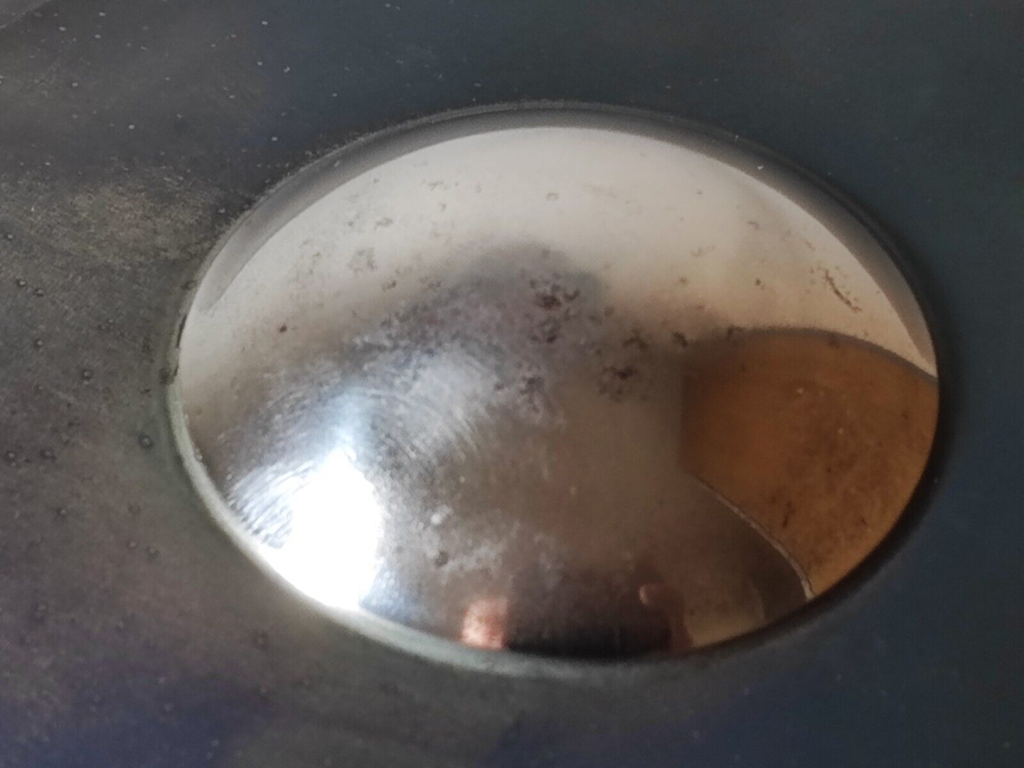 Die Oberfläche weist alters- und besitzerbedingt an einigen kleinen Stellen leichten Rost auf. Die Farbe der Oberseite hat sich verändert, was den Klang jedoch nicht beeinträchtigt. Auf der Oberseite befindet sich eine kleine Delle (siehe Fotos).