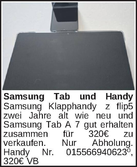 Samsung Klapphandy z flip5 zwei Jahre alt wie neu und Samsung Tab A 7 gut erhalten zusammen für 320€ zu verkaufen.