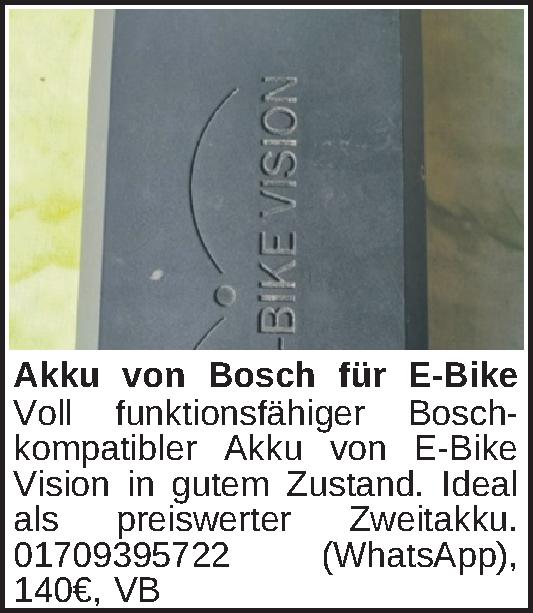 Voll funktionsfähiger Bosch-kompatibler Akku von E-Bike Vision in gutem Zustand. Ideal als preiswerter Zweitakku. 01709395722 (WhatsApp)Kontakt