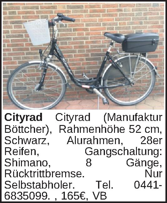 Cityrad (Manufaktur Böttcher), Rahmenhöhe 52 cm, Schwarz, Alurahmen,28er Reifen, Gangschaltung: Shimano, 8 Gänge, Rücktrittbremse. Nur Selbstabholer. Tel. 0441-6835099.