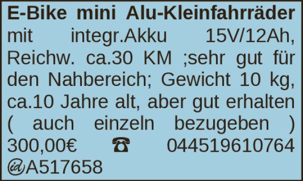 Alu-Kleinfahrräder mit integr.Akku 15V/12Ah, Reichw. ca.30 KM ;sehr gut für den Nahbereich; Gewicht 10 kg, ca.10 Jahre alt, aber gut erhalten ( auch einzeln bezugeben )Kontakt