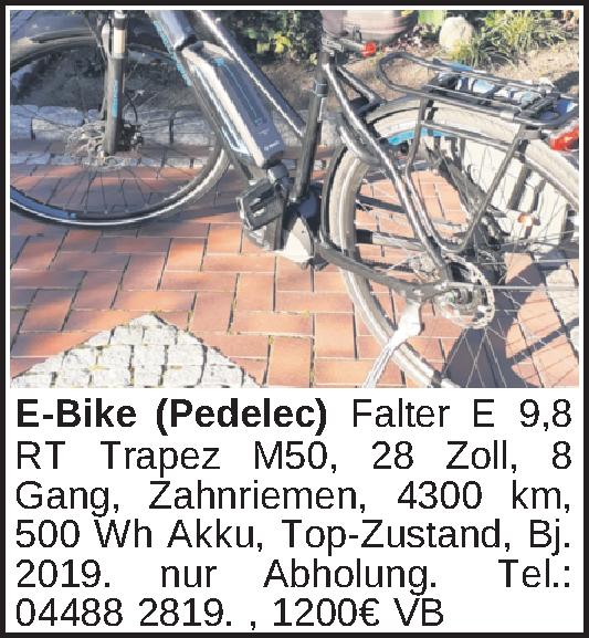 Falter E 9,8 RT Trapez M50, 28 Zoll, 8 Gang, Zahnriemen, 4300 km, 500 Wh Akku, Top-Zustand, Bj. 2019. nur Abholung. Tel.: 04488 2819.Kontakt