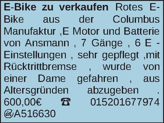 Rotes E-Bike aus der Columbus Manufaktur ,E Motor und Batterie von Ansmann , 7 Gänge , 6 E - Einstellungen , sehr gepflegt ,mit Rücktrittbremse , wurde von einer Dame gefahren , aus Altersgründen abzugeben .