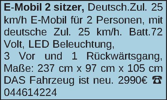 E-Mobil für 2 Personen, mit deutsche Zul. 25 km/h. Batt.72 Volt, LED Beleuchtung,