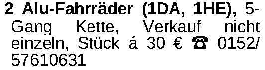 2 Alu-Fahrräder (1DA, 1HE), 5Gang Kette, Verkauf nicht einzeln, Stück á 30 € 0152/ 57610631
