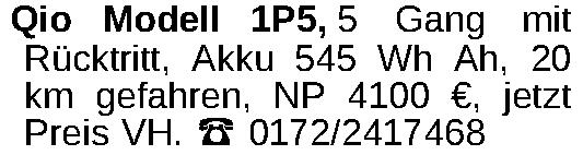 Qio Modell 1P5, 5 Gang mit Rücktritt, Akku 545 Wh Ah, 20 km gefahren, NP 4100 €, jetzt Preis VH. ‡ 0172/2417468Kontakt
