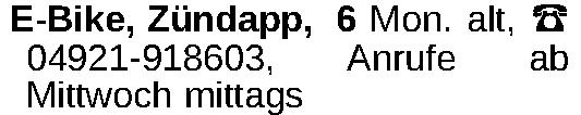 E-Bike, Zündapp, 6 Mon. alt, 04921-918603, Anrufe ab Mittwoch mittags