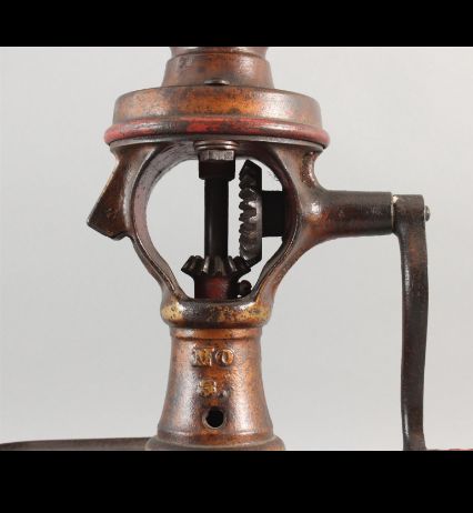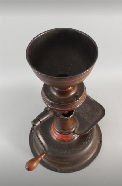 Dieses äußerst seltene Modell verfügt über ein offenes Gehäuse, das die Zahnräder freilegt. Es gibt keine Hinweise darauf, dass der Deckel jemals geschlossen war. Anstelle einer Schublade zum Auffangen des Kaffeepulvers besitzt es eine herausnehmbare Schale für einen Behälter. Der gusseiserne Sockel mit einem Durchmesser von 25,4 cm (10 Zoll) ist mit Schraublöchern zur Befestigung auf einer Arbeitsplatte versehen. In den Sockel ist die Aufschrift „Enterprise Mfg. Co. P.A., Philad’a. - Pat’ June 21, 1870“ eingeprägt. Die Seite des Auslaufs trägt entweder die Zahl 8 oder die Zahl 3. Die Maschine hat ihren originalen Erstanstrich und ist insgesamt 41,3 cm (16 ¼ Zoll) hoch. Sie ist groß und schwer (7,7 kg/17 Pfund) und befindet sich in vollständigem, funktionsfähigem und originalem Zustand.Kontakt