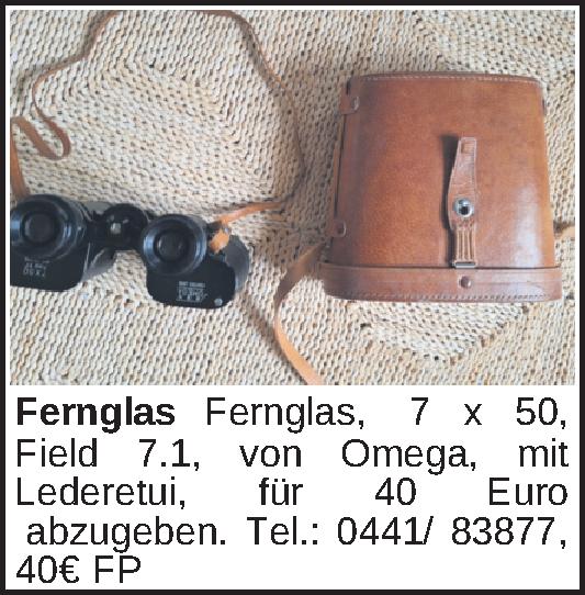 Fernglas, 7 x 50, Field 7.1, von Omega, mitLederetui, für 40 Euro abzugeben.
