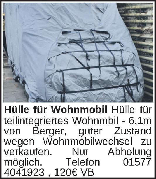 Hülle für teilintegriertes Wohnmbil - 6,1m von Berger, guter Zustand wegen Wohnmobilwechsel zu verkaufen.Nur Abholung möglich. Telefon 01577 4041923