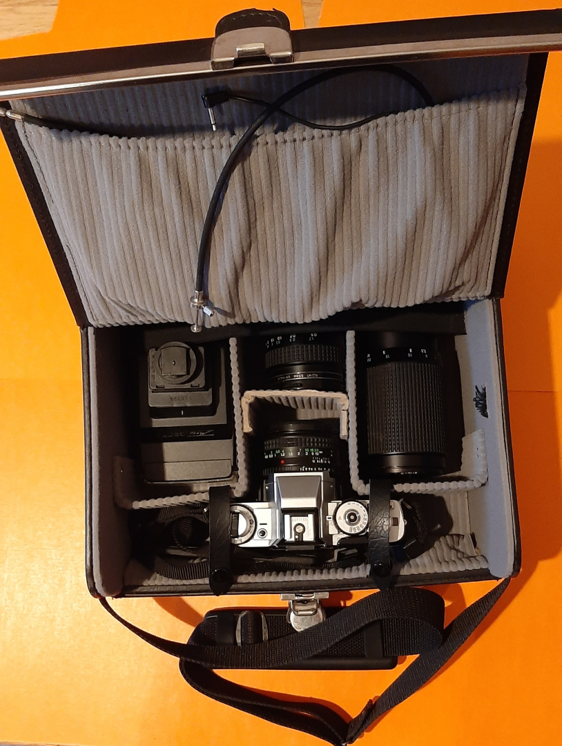 Ich biete hier ein sehr gut erhaltenes, voll funktionsfähiges analoges Kameraset an – ideal für Liebhaber klassischer Fotografie, Einsteiger in die analoge Welt oder Sammler.Alles stammt aus gepflegtem Privatbesitz und wurde stets sorgfältig aufbewahrt.