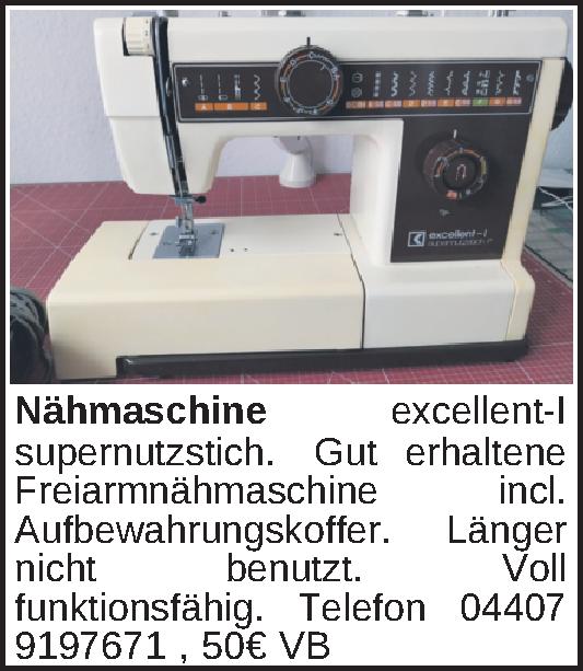 excellent-I supernutzstich. Gut erhaltene Freiarmnähmaschine incl. Aufbewahrungskoffer. Länger nicht benutzt. Voll funktionsfähig. Telefon 04407 9197671