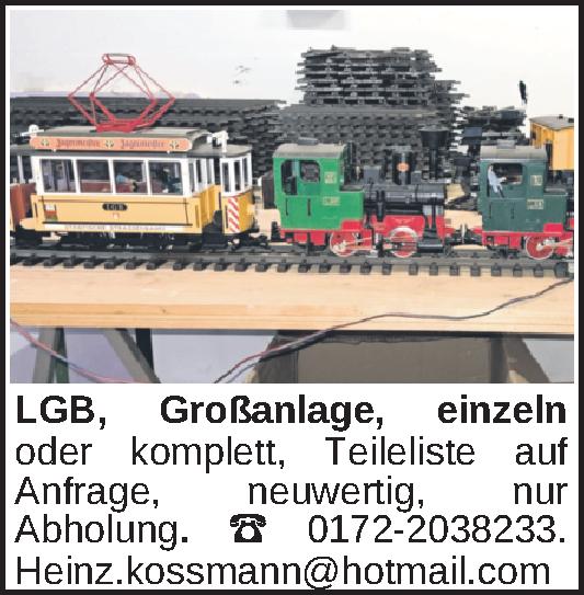 LGB, Großanlage, einzeln oder komplett, Teileliste auf Anfrage, neuwertig, nur Abholung. 0172-2038233. Heinz.kossmann@hotmail.com