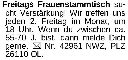 Freitags Frauenstammtisch sucht Verstärkung! Wir treffen uns jeden 2. Freitag im Monat, um 18 Uhr. Wenn du zwischen ca. 55-70 J. bist, dann melde Dich gerne. ¤ Nr. 42961 NWZ, PLZ 26110 OL.