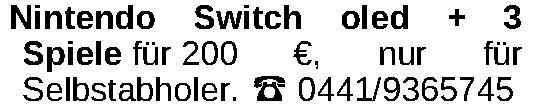 Nintendo Switch oled + 3 Spiele für 200 €, nur für Selbstabholer. ‡ 0441/9365745Kontakt