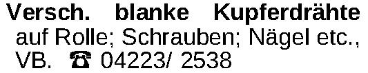Versch. blanke Kupferdrähte auf Rolle; Schrauben; Nägel etc., VB. ‡ 04223/ 2538Kontakt