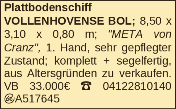VOLLENHOVENSE BOL; 8,50 x 3,10 x 0,80 m; "META VON CRANZ", 1. Hand, sehr gepflegter Zustand; komplett + segelfertig, aus Altersgründen zu verkaufen.Kontakt